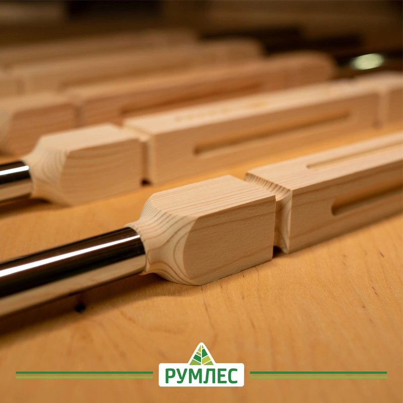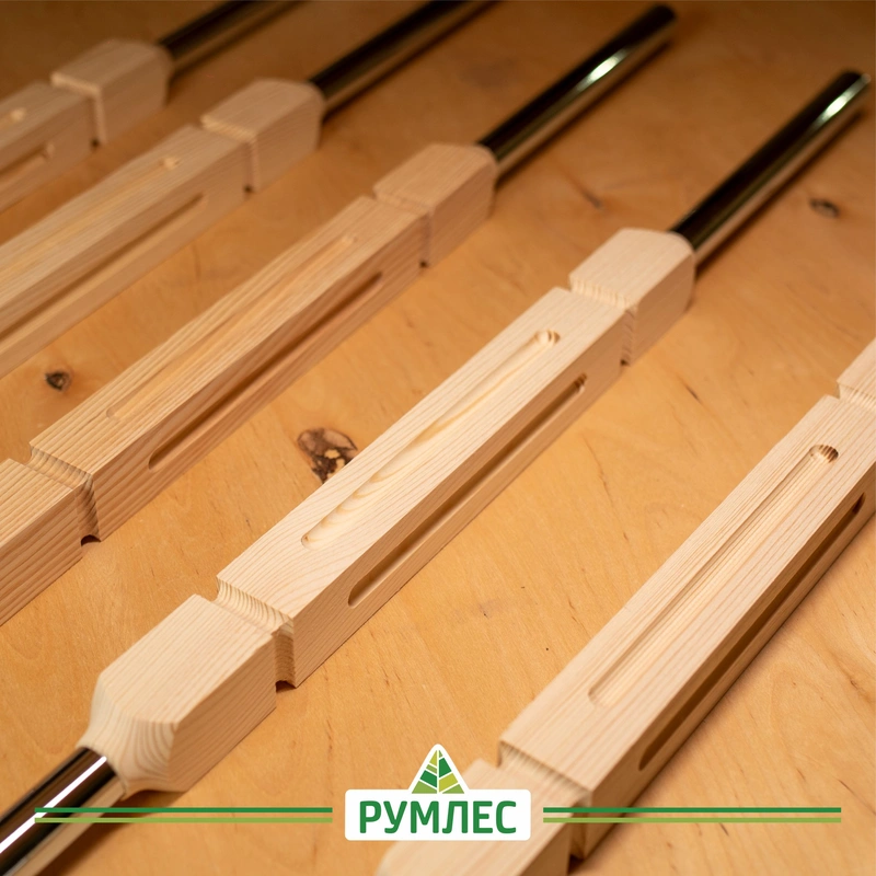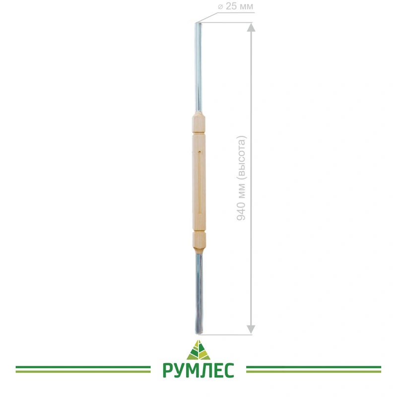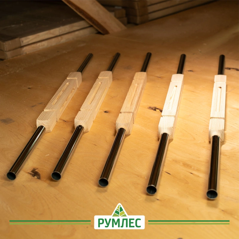 Комбинированная балясина состоит из хромированной трубы Ø 25мм и деревянного элемента из сосны. Снизу балясина крепится с помощью фланца, сверху к поручню — на специальное крепление.