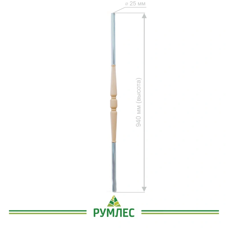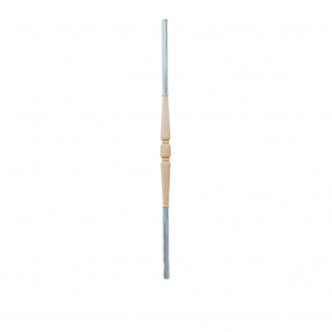 Комбинированная балясина состоит из хромированной трубы Ø 25мм и деревянного элемента из сосны. Снизу балясина крепится с помощью фланца, сверху к поручню — на специальное крепление.
