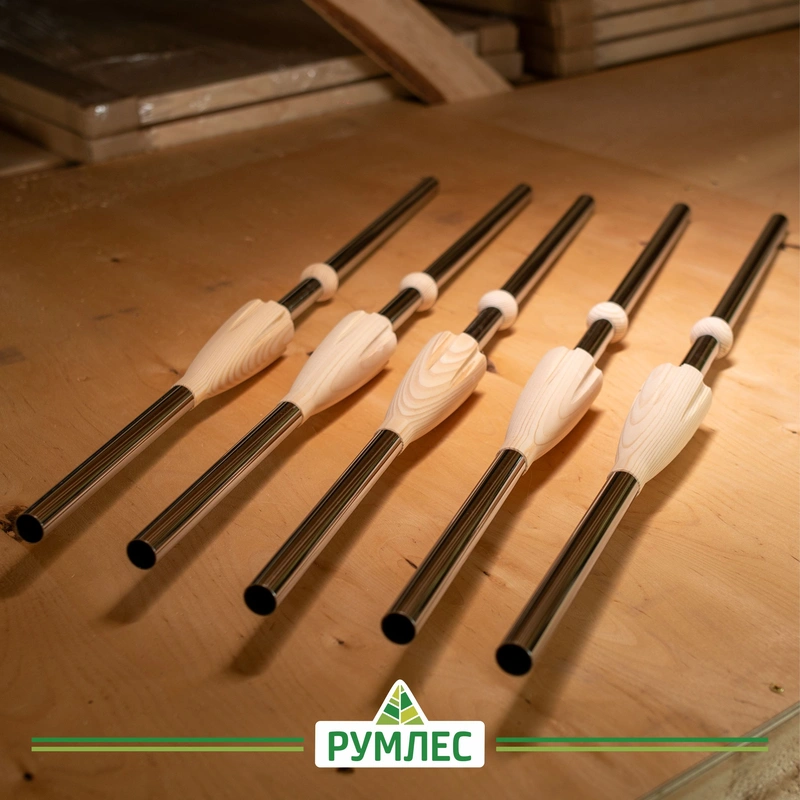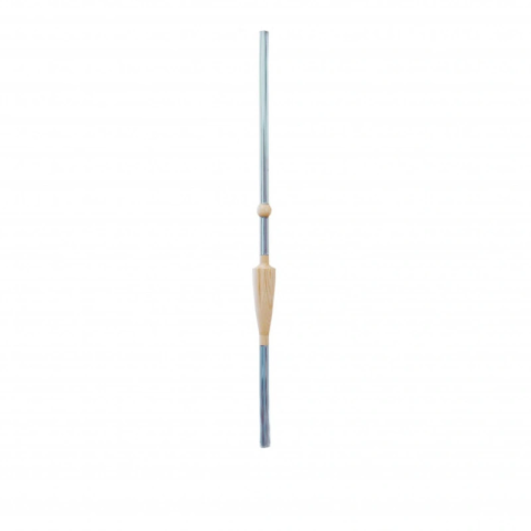 Комбинированная балясина состоит из хромированной трубы Ø 25мм и деревянного элемента из сосны. Снизу балясина крепится с помощью фланца, сверху к поручню — на специальное крепление.