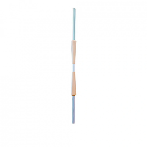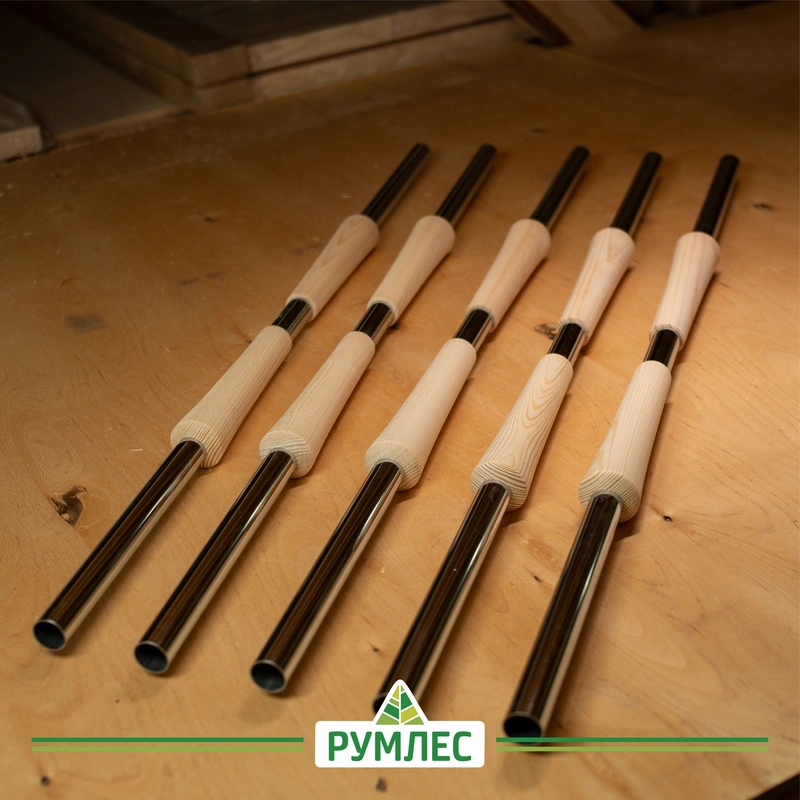 Комбинированная балясина состоит из хромированной трубы Ø 25мм и деревянного элемента из сосны. Снизу балясина крепится с помощью фланца, сверху к поручню — на специальное крепление.