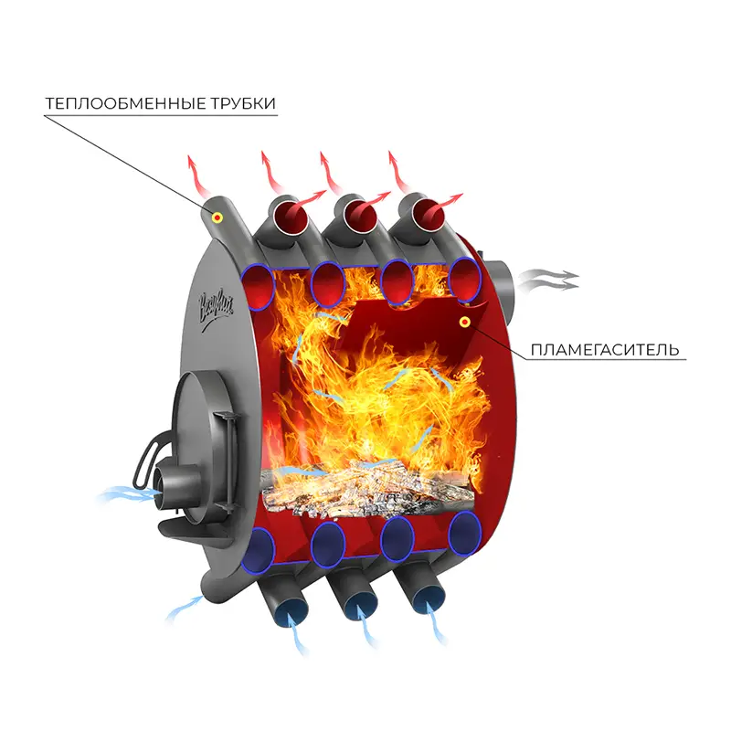 - Печь конвекционного типа с КПД 75-80% и системой длительного горения топлива.