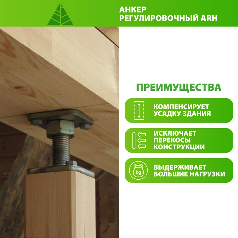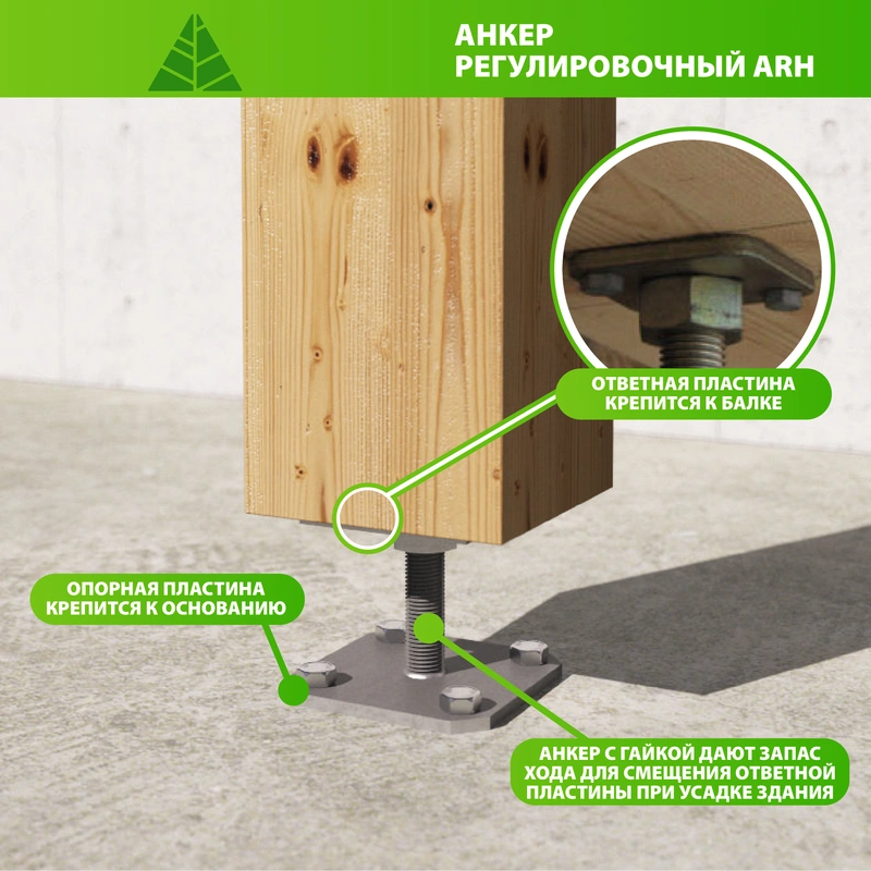 - Отсутствие перекосов при усадке. Анкер регулировочный подстраивается под неизбежную усадку деревянной конструкции и позволяет избежать деформации здания.