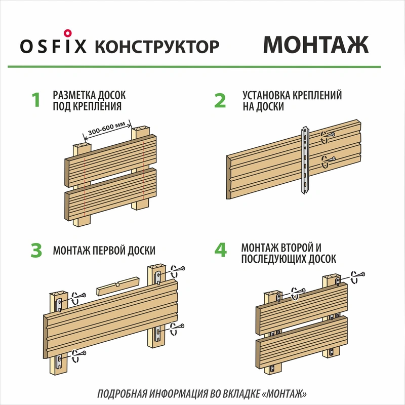 Установите вторую доску с креплением OSFIX Конструктор так, чтобы нижняя часть крепежа на монтируемой доске заходила в зазор между направляющей и первой доской. Доведите монтируемую доску до дистанцира. Закрепите саморезами с верхней стороны крепления OSFIX Конструктор. Аналогичным образом монтируйте все последующие доски.