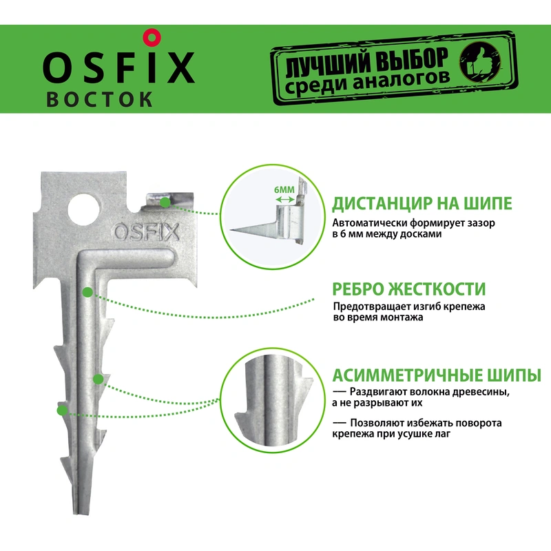 - 6 шипов позволяют избежать поворота крепежа при усушке лаг.