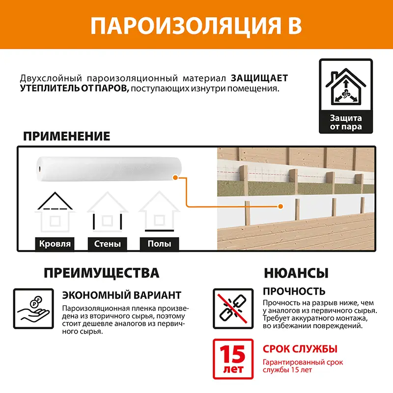 Пароизоляционная пленка B защищает утеплитель от паров, поступающих изнутри помещения.