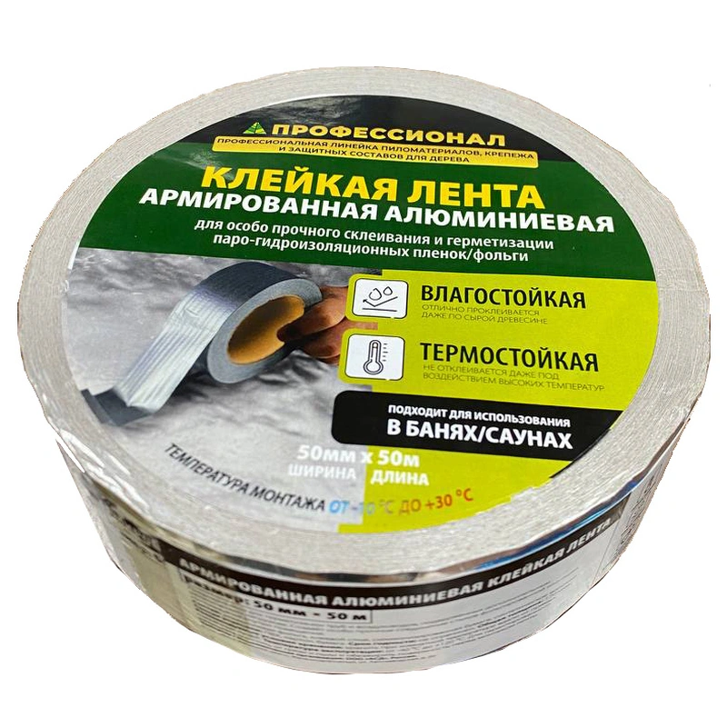 Алюминиевая армированная клейкая лента «Профессионал» предназначена для герметичного проклеивания стыков и швов при монтаже паро-гидроизоляционных пленок и фольги, для герметизации соединительных швов труб, воздуховодов, корпусов, узлов и при других строительных, ремонтных, монтажных работах. Основа ленты выполнена из слоев алюминиевой фольги и специальной бумаги, между которыми расположены синтетические волокна, выполняющие функцию армирования. Акриловый клеевой слой защищен дополнительным вкладышем.