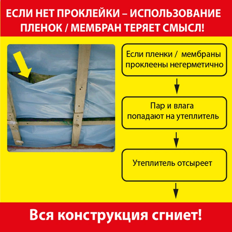 Паро-гидроизоляционные пленки, мембраны и фольгу обязательно нужно проклеивать специальной клейкой лентой на трех участках: